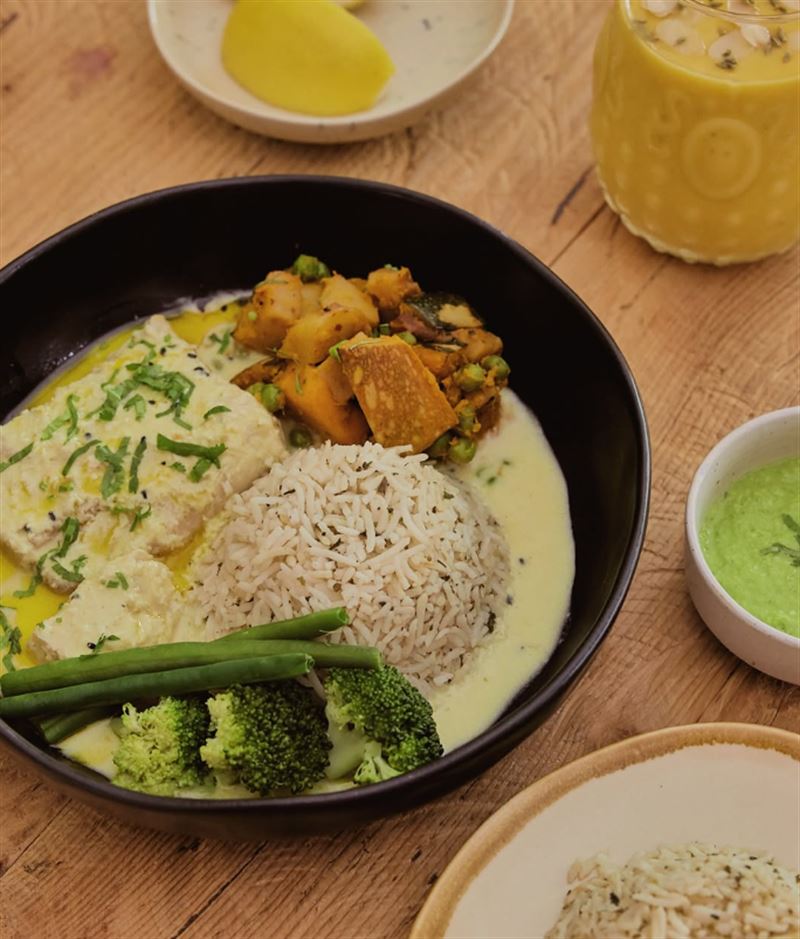 Lamb and lentil Indian curry with aromatic spices, couscous, vegetables, cucumber, radish and raita salad.