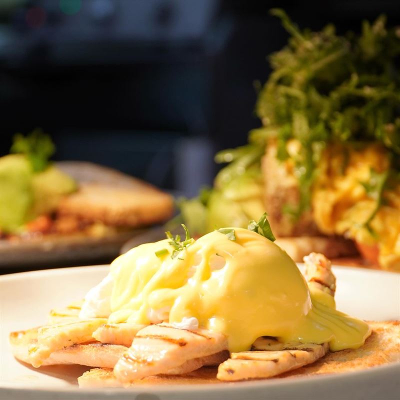 Grilled ham benedict topped with hollandaise with your choice of eggs and toasted bread.