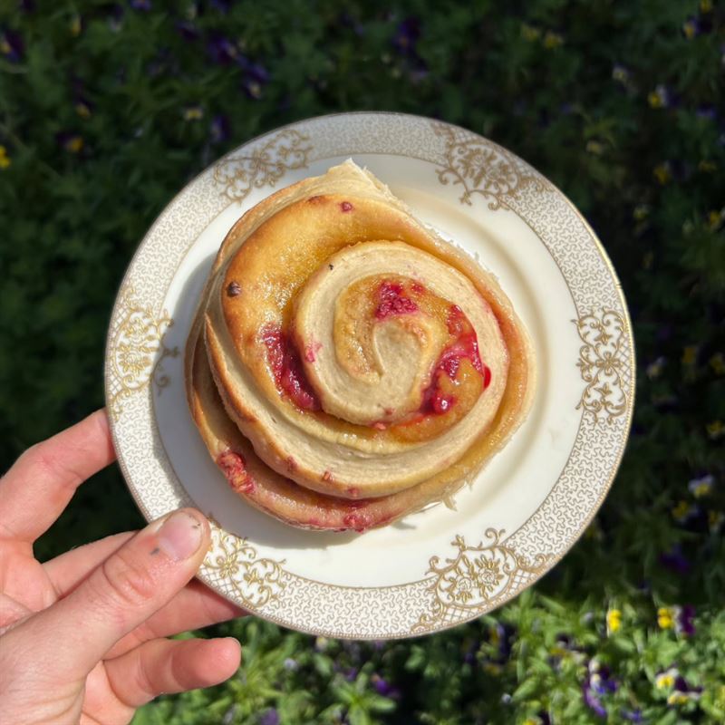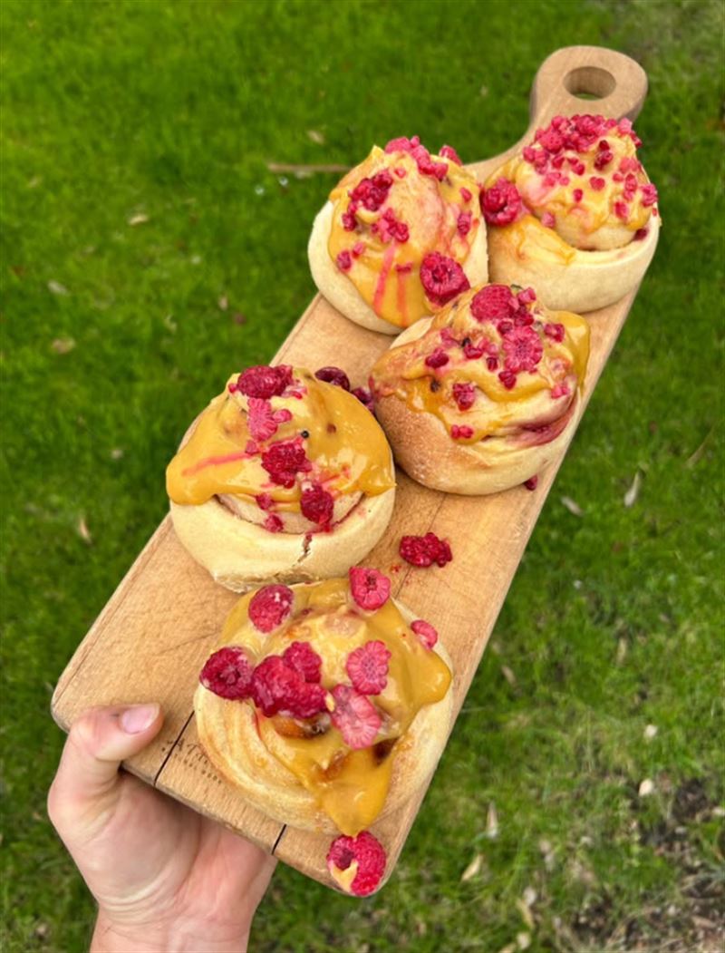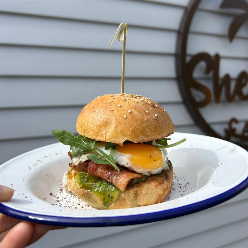 Otway bacon, local free range fried egg, house macadamia pesto, organic cheddar, organic chutney and roquette served in a sourdough brioche roll.