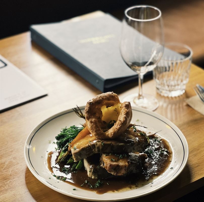 Lamb shoulder, herb roasted, served with potatoes, sautéed greens, Dutch carrots, caramelised garlic and rosemary jus.