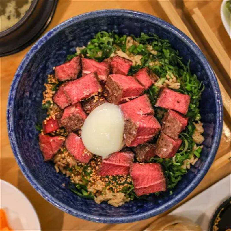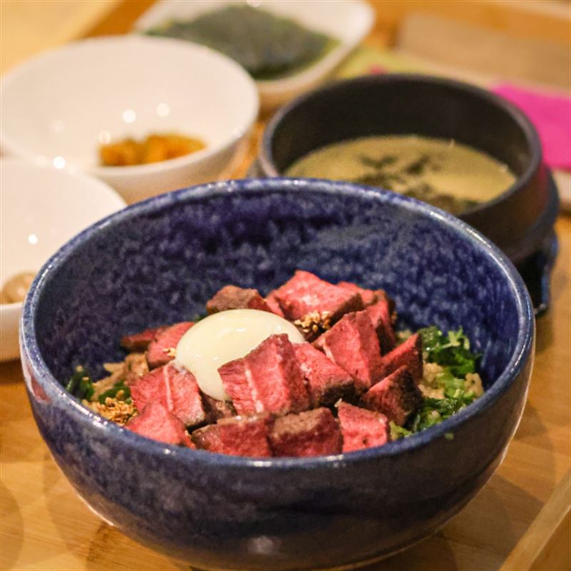 Angus Tender Sotbap: seared Angus beef, served on top of steamed sotbap.