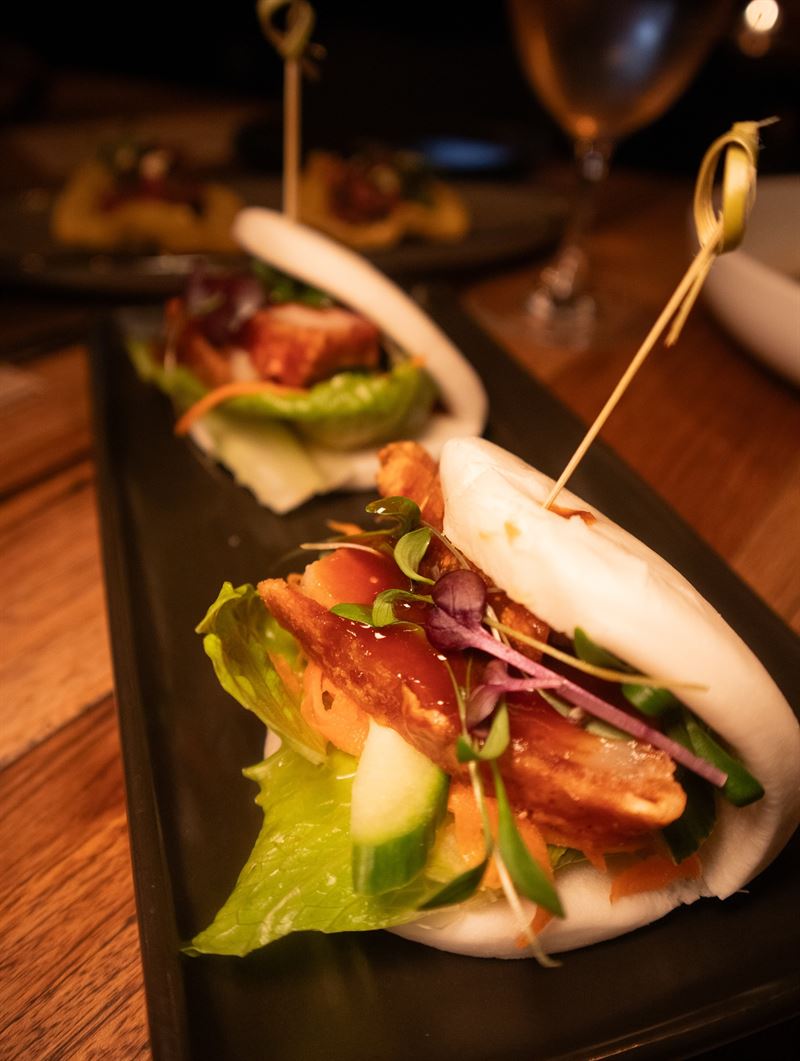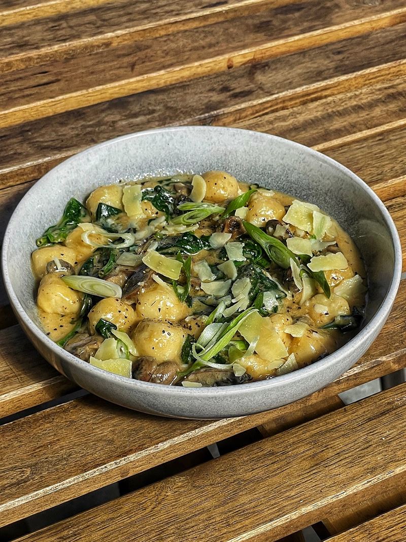 Massaman gnocchi with crispy five-spice duck breast, peas, seasonal medleys, spinach, Thai basil, coconut cream and roasted peanut.