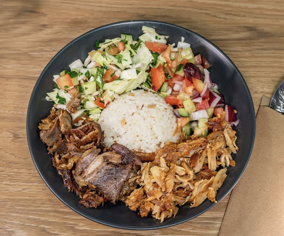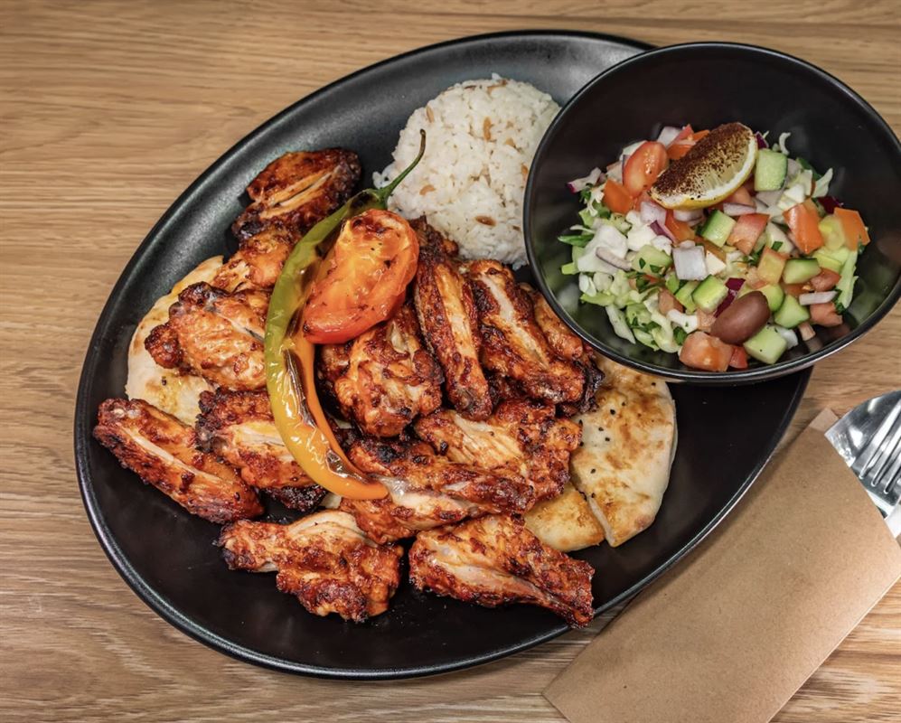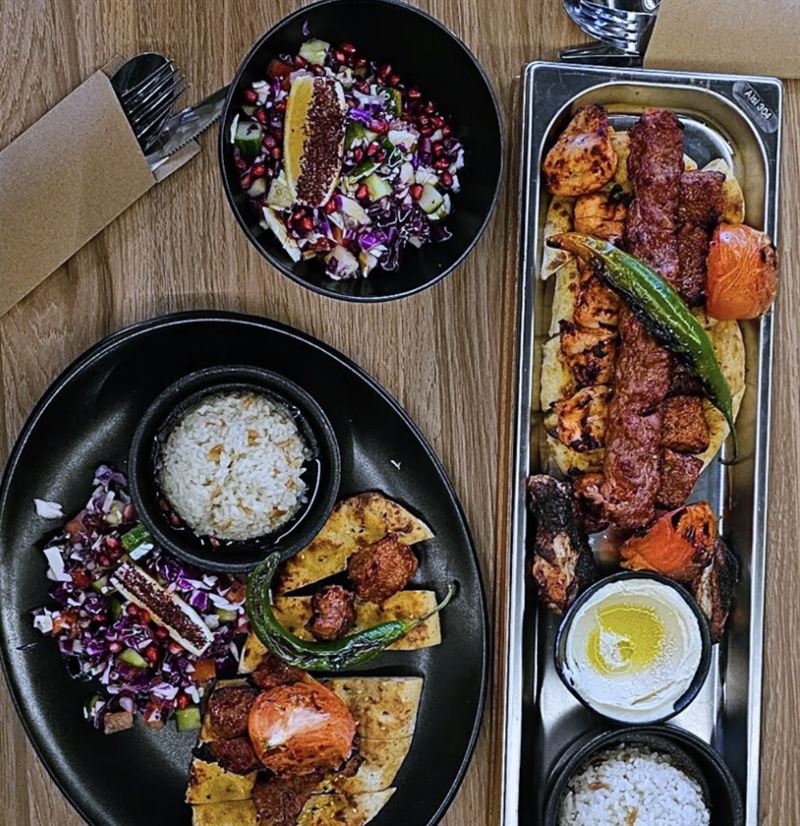 Charcoal-grilled lamb, tender chicken, and spiced Adana kebab paired with juicy chicken wings, served alongside fluffy rice, fresh salad, and warm bread.