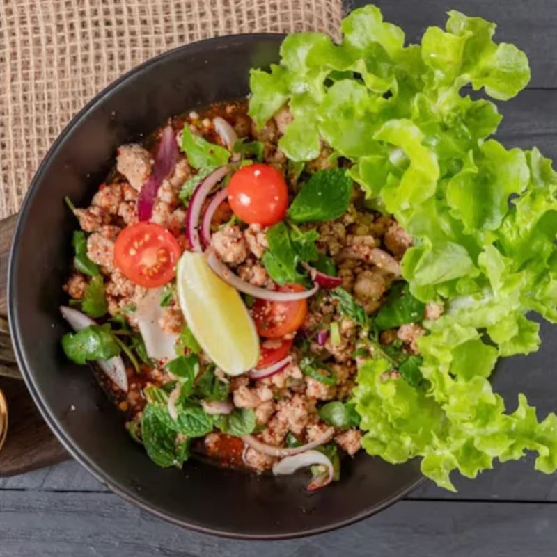 Larb Gai made with Chicken Minced Salad With Onion, Thai Herbs, Ground Dried Chilli, Roasted Rice, Lime Juice and Fish Sauce.