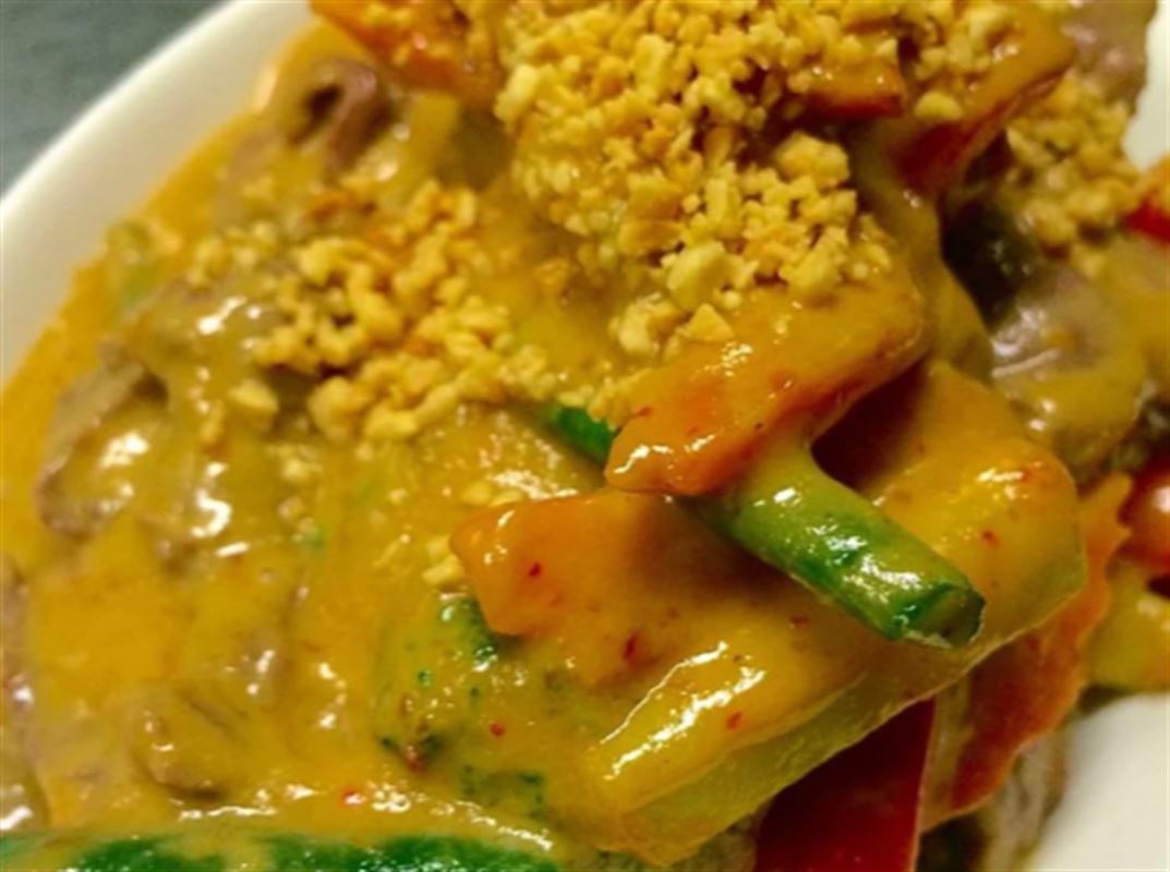 Roasted duck red curry with pineapple, tomatoes, basil and coconut milk.