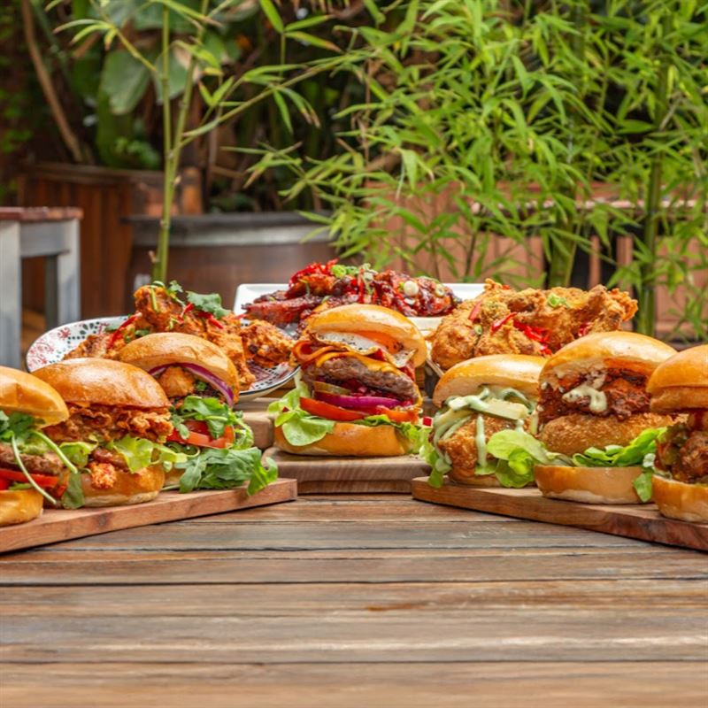 Burgers such as Outback Sally with a beef patty, pulled pork, cheese, onion rings, lettuce and BBQ sauce.