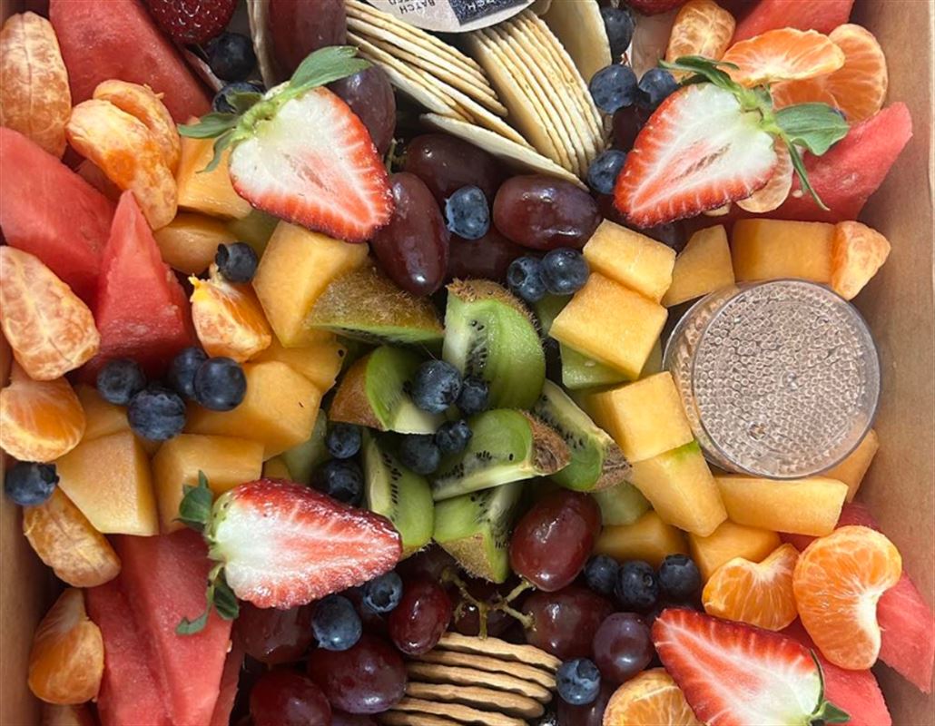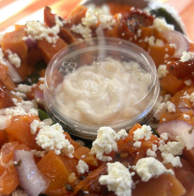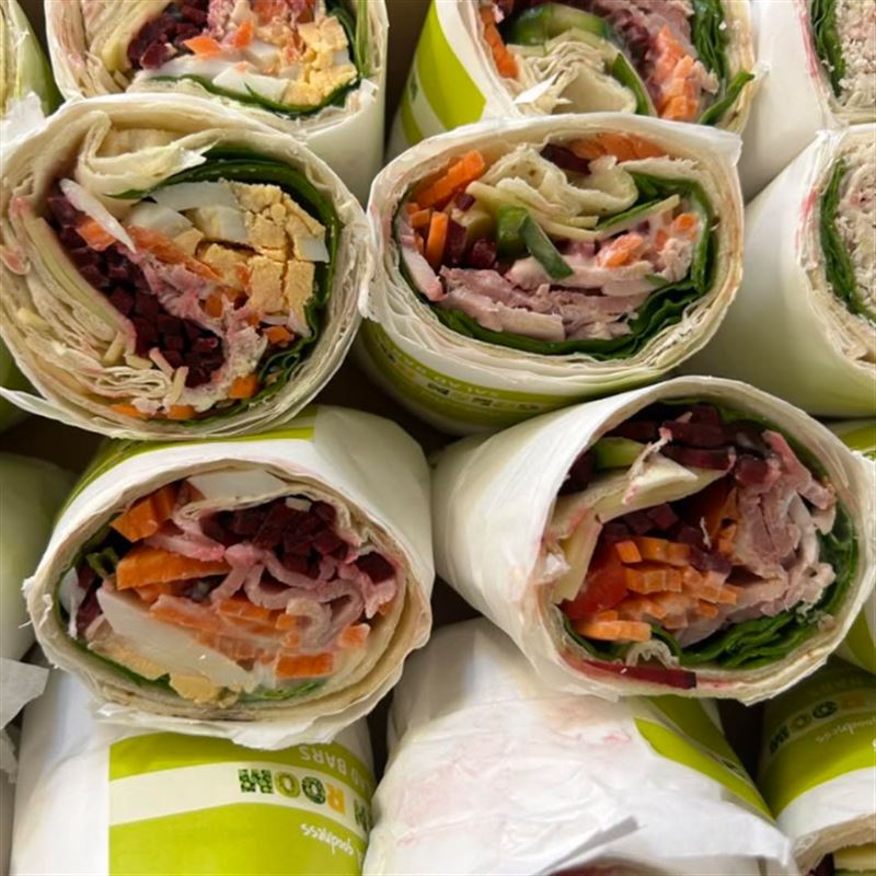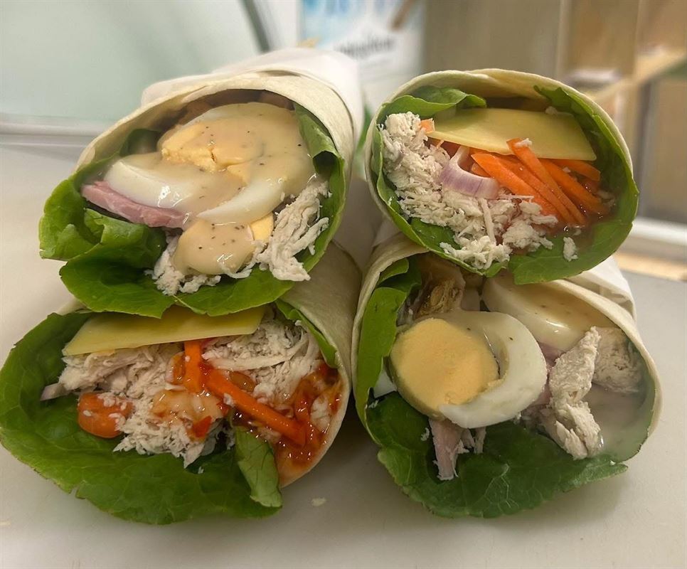 Salad bar choices such as rocket with tandoori spiced chicken breast, sun-dried tomato, red onion, cucumber, carrot, beetroot, cheese and aioli.