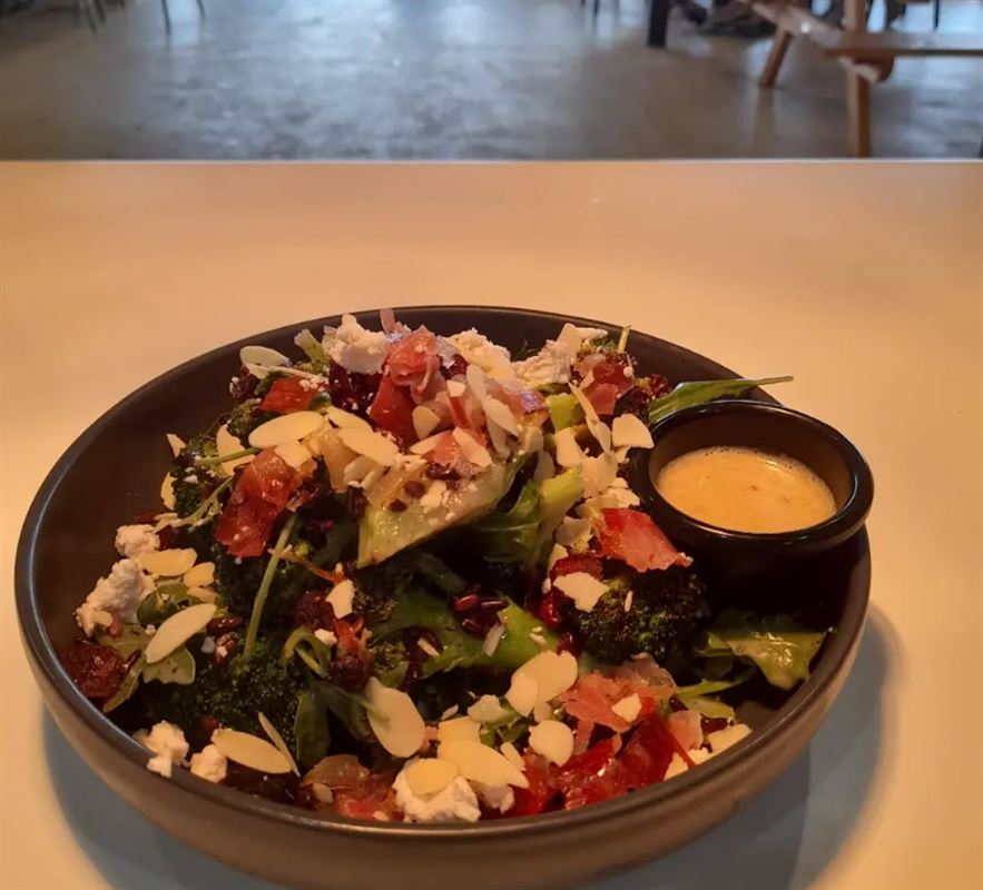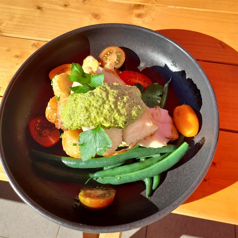 Tasmanian Atlantic Salmon is served with Asian salad and roasted chat potatoes.