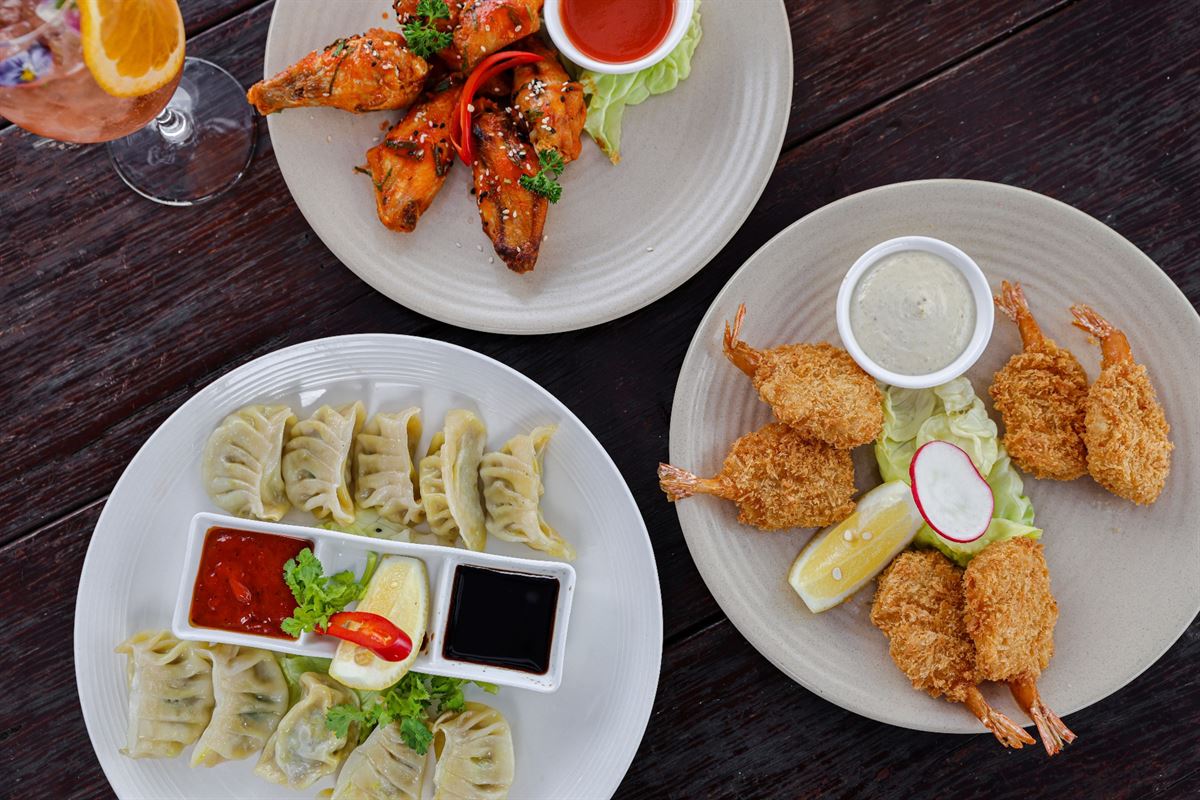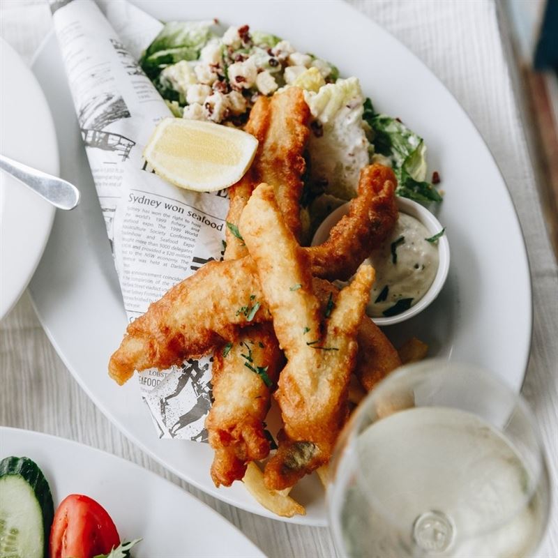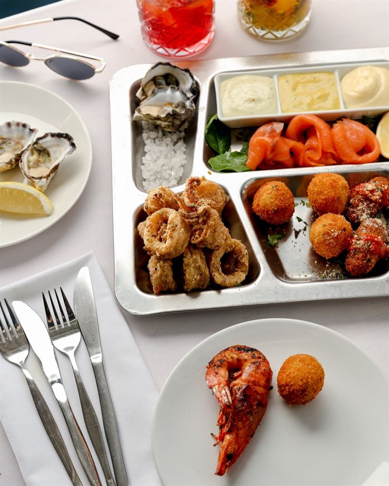 Seafood platter with oysters, Tiger prawns, smoked salmon, flathead, BBQ King prawns, crab claws, calamari and grilled octopus, served with chips and salad.