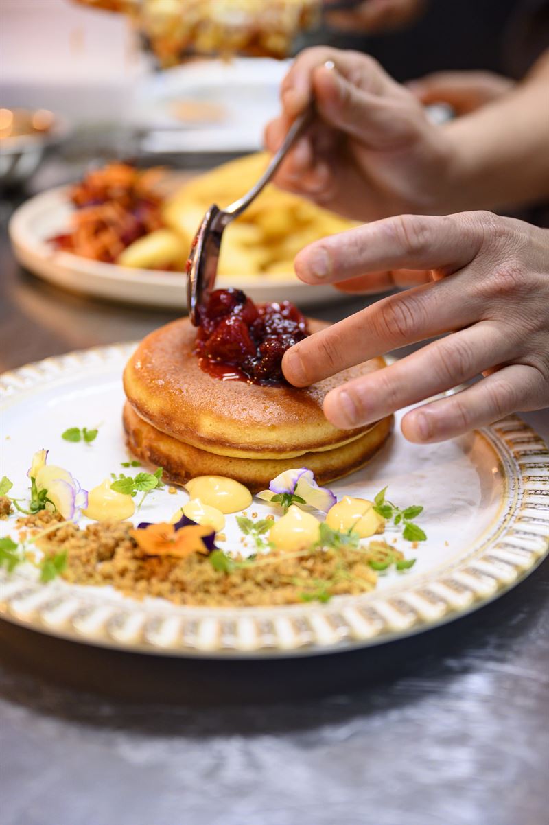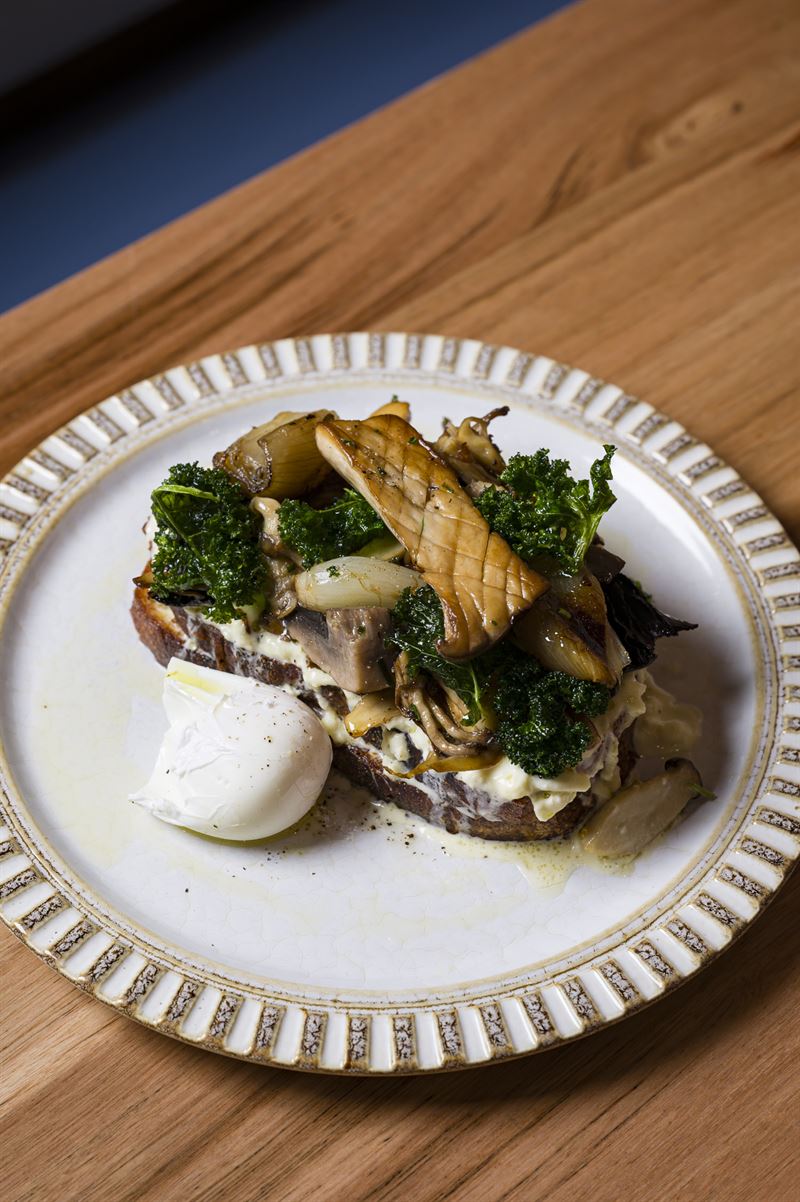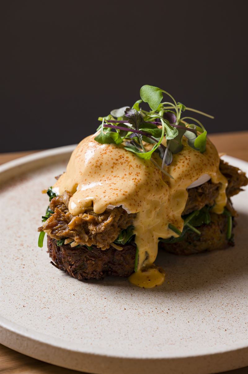 Poached eggs with a choice of smoked salmon or bacon, hollandaise on sourdough.