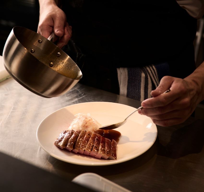 Onglet of beef, sauce au poivre, wild roquette.