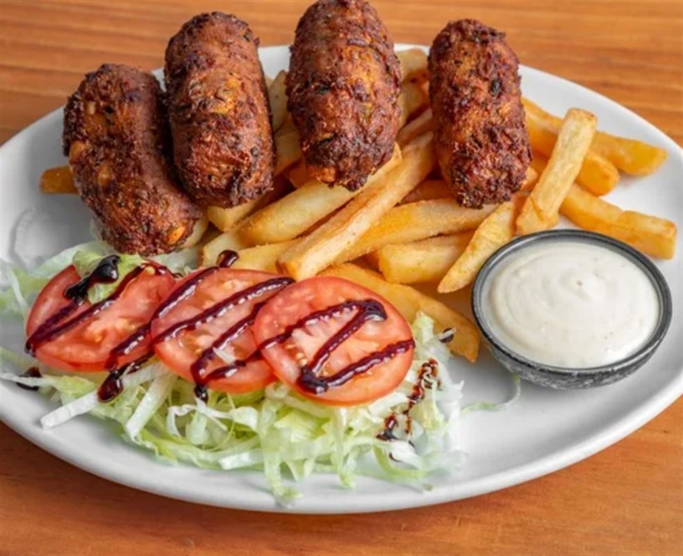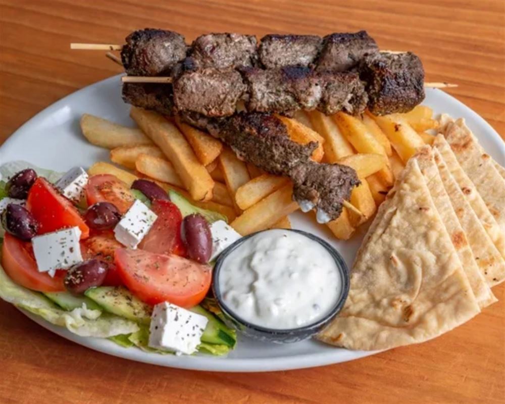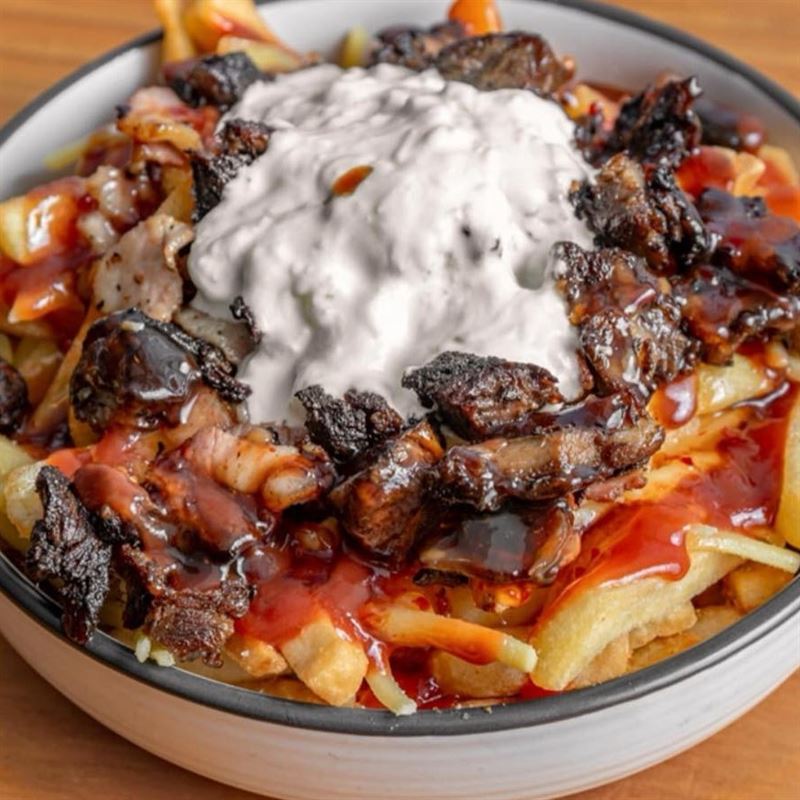 The Greek AB is made with hot chips topped with tender pieces of marinated meat, bacon, cheese, tomato sauce, barbecue sauce, sweet chilli sauce, and garlic sauce.
