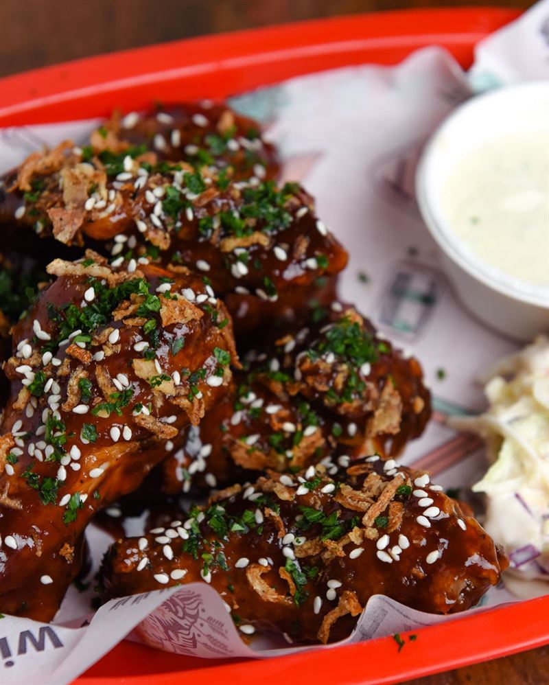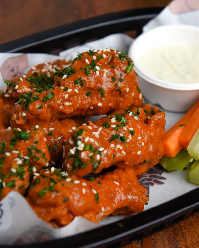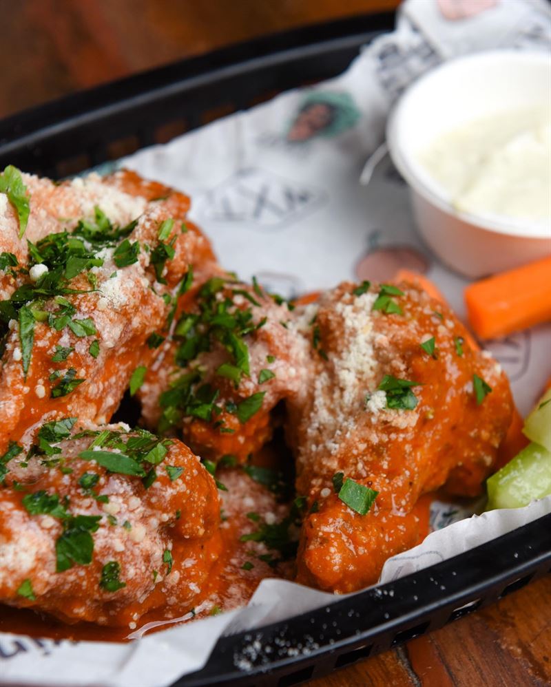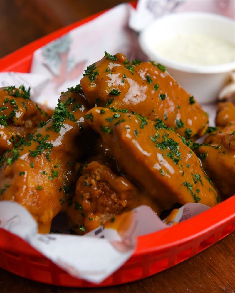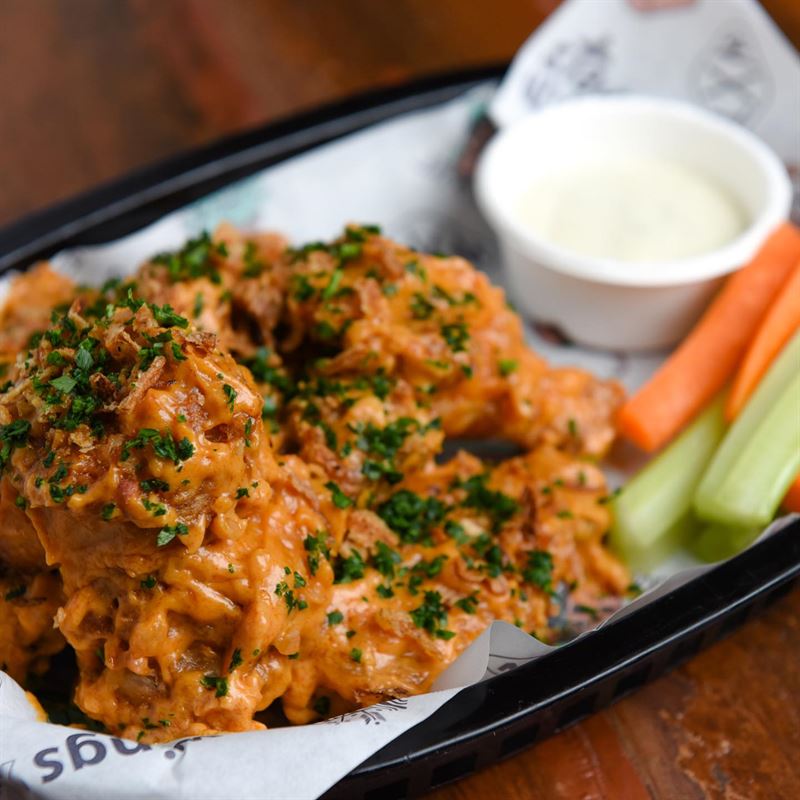 Buffalo wings served with house-made blue cheese dipping sauce, featuring bold flavours like House Buffalo with charred capsicum, garlic, vinegar and spices, or the fiery Frank’s Original hot sauce.