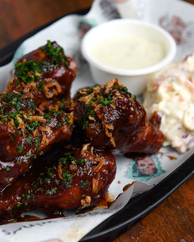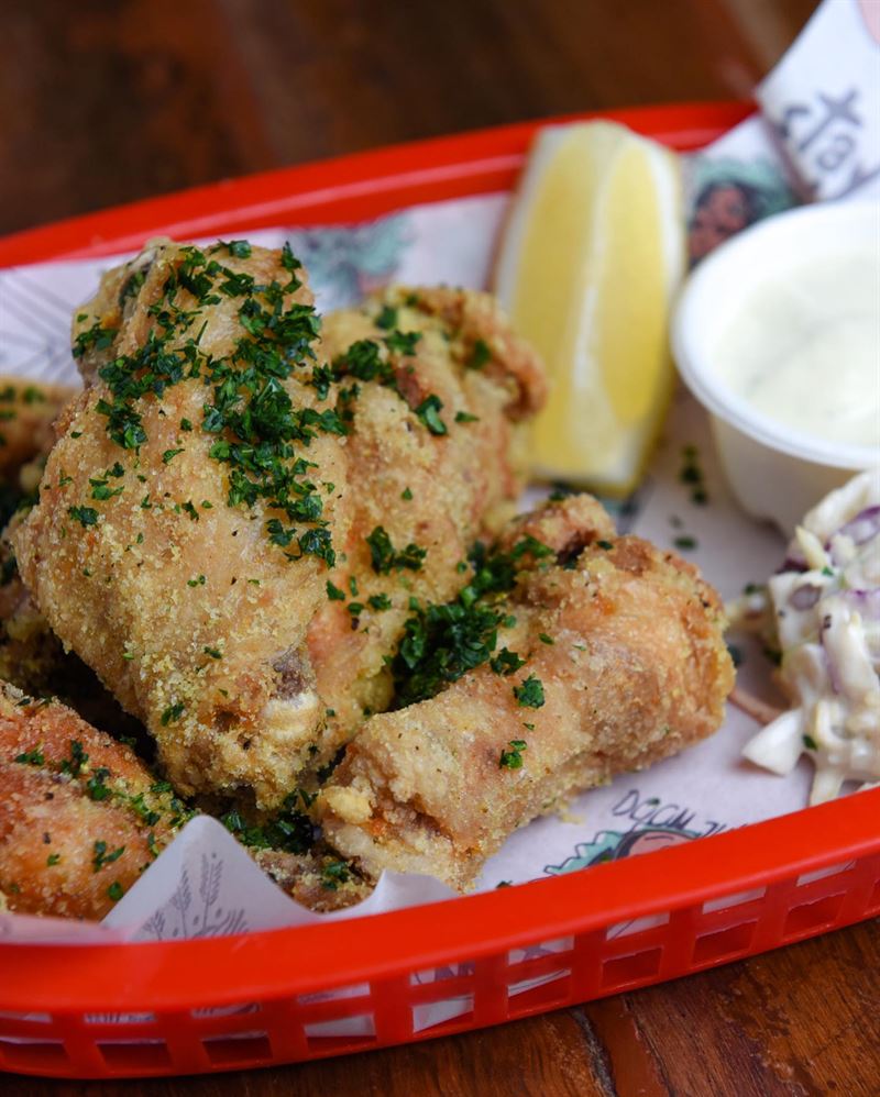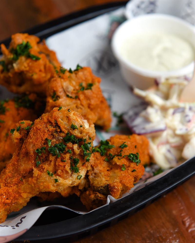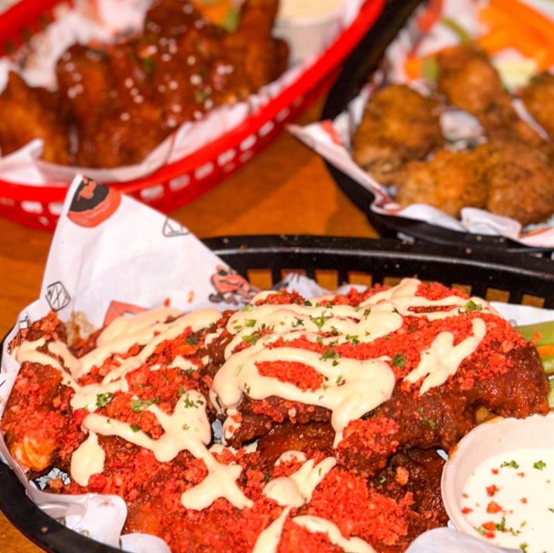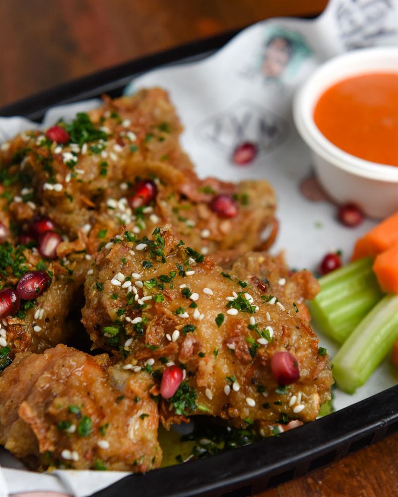 Buffalo wings served with house-made blue cheese dipping sauce, featuring bold flavours like House Buffalo with charred capsicum, garlic, vinegar and spices, or the fiery Frank’s Original hot sauce.